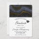 A graduation invitation with a beautiful image of dark abstract agate stone. Colours swirl in waves. Main colours are black, blue-grey with a faux-gold ribbon running through the design. A black graduation cap above the word "graduate". Modern and trendy.