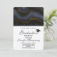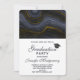 A graduation invitation with a black graduation cap and a beautiful image of dark abstract agate stone. Colours swirl in waves. Main colours are black, blue-grey with a faux-gold ribbon running through the design. Modern and trendy.