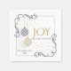 Christmas Wedding Party Napkin | Modern Black and Gold Minimal Holiday Baubles - three black and gold striped Christmas ornaments hang at varying levels - paired with gold corner scrolling and contemporary font 'JOY ' make this appealing for a Wedding or Holiday Party - customise with your information easily - this is part of the Modern Black and Gold Minimal Holiday Baubles Collection