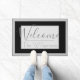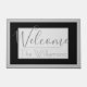 This stylish, sophisticated, and modern design welcome mat features a gray background with a black border and matching gray frame. The center text box features a soft gray background with the greeting "Welcome" printed in an elegant medium toned gray font, followed by a sample family name that you can personalize.