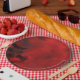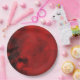 Paper plates with a modern abstract pattern. Red and black colours swirl, mix and mingle together. Creative, artistic and unique with a dark, mysterious flair.