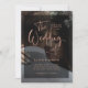These modern, elegant wedding invitations feature your own personal photo covering the background completely. A sheer black overlay contains faux rose gold trendy script typography, and the back of the card is black. A glam, stylish look your guests will love!