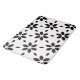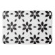 A chic black and white abstract floral print features elegant black flower petal shapes on a crisp white background.