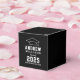 Modern graduation party favour boxes feature a grad cap with simple and white typography design that can be personalised with the graduate's name and school. Black background can be customised to match any school or party theme colour.