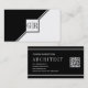 Modern black and white monogram and triangles modern geometric architect business card. The front includes two diagonal stripes one black and one white that separate the card in two triangles. A white square is on the center with your monogram. The back is of black color with two white lines and a QR code for more info.