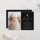 The simple baptism invitations feature a casual white calligraphy script with a black background for a design that is perfect for a modern baby baptism. Personalise the elegant baptism invitations with your child's photo, name, and religious event details below. The back of the black and white photo baptism invitation provides space for additional text and photos. The gender-neutral design is perfect for both girls and boys.
