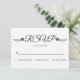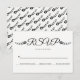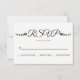 Modern black and white typography and flowers floral wedding RSVP reply card. It showcases your text in a cursive script style typography and two small black flowers with leaves. The backside includes a floral black and white pattern.