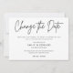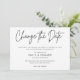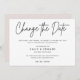 Custom-designed wedding postponement/change the date card featuring modern black and white hand lettering design on the front, coloured background on the back.