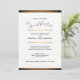 A Modern Minimalist Black and White With Gold Wedding Invitation trimmed in black borders on a white background with gold accents. The front side text includes: Wedding Invitation, Together With Their Families, The Bride and Groom's Names, Request The Honour of Your Presence at their Wedding, Wedding Date and Time, Location and Address, with Reception Note. The reverse text include: RSVP and your Reply Details on a black background with gold accent. To personalise simply insert your text into our easy template, replacing the sample.