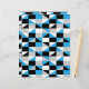 This scrapbook paper features a modern geometric design with triangles and rectangles in sky blue, black, grey, and white.