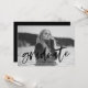Invite guests to your graduation party in style with our Modern Brushed Script yellow graduation invitations. The unique graduation party invite features 'graduate' in a black modern hand-lettered script font overlay on the front. Add your favourite photo and the graduate's name, school, and graduating year. Add your graduation party details to the back.