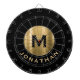 Modern black dart board with a brushed metallic gold emblem with classic block typography initial and name. Personalise with name and initial.