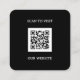 Modern and minimal black and white square business card design features your business logo and custom QR code on the back.
