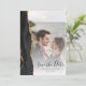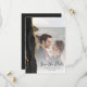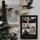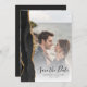The left-hand edge of this elegant modern wedding save the date card features a black watercolor agate border trimmed with faux gold glitter. The customisable text overlay combines black handwriting script and copperplate fonts over your photograph. The reverse side provides spaces for five additional photos (one square, three horizontal and one vertical), along with your wedding website URL or other message in gold-coloured text on an off-black background. Easily replace the sample images with your own photos.