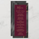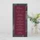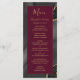 This elegant, modern wedding menu features a watercolor black agate background trimmed with gold faux glitter. The text appears in elegant gold-coloured handwriting and copperplate fonts on a burgundy rectangle. The agate design is repeated on the reverse.