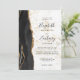The left-hand edge of this elegant modern wedding invitation features a black watercolor agate border trimmed with faux gold glitter. The customizable text combines black handwriting, copperplate and italic fonts on a gold and white marble texture background. The reverse side features a matching black and gold agate design.