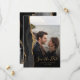 The left-hand edge of this elegant modern wedding save the date card features a black watercolor agate border trimmed with faux gold glitter. The customizable text overlay combines gold-colored handwriting script and copperplate fonts. A black gradient filter helps make the text pop. Easily replace the sample image with your own vertical photo. The reverse side features a matching black and gold agate design.