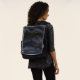 A personalised backpack with a beautiful image of dark abstract agate stone. Colours swirl in waves. Main colours are black, blue-grey with a faux-gold ribbon running through the design. Modern and trendy.