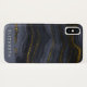 Phone case with a beautiful image of dark abstract agate stone. Colours swirl in waves. Main colours are black, blue-grey with a faux-gold ribbon running through the design. Modern and trendy.