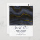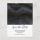 A wedding save the date postcard with a beautiful image of dark abstract agate stone. Colours swirl in waves. Main colours are black, blue-grey with a faux-gold ribbon running through the design. Modern and trendy.