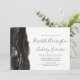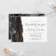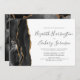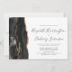The left-hand edge of this elegant modern wedding invitation features a black watercolor agate border trimmed with faux gold glitter. The customisable text combines handwriting, copperplate and italic fonts in charcoal grey on a white background. The reverse side features a matching black and gold agate design.