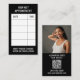 Modern black and white hair stylist business appointment cards with the reminder date and time for the client, the name of the brand or the professional, and space to add a phone number and website or social handles. A scannable QR code for online bookings is available on the back along with a custom picture. All text is editable.