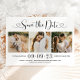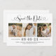 Modern black and white wedding save the date announcement cards feature a collage of three square engagement photos and a stylish black typography design with chic calligraphy script and a heart accents. The simple and elegant custom text that can be completely personalised with the numerical wedding date, bride and groom names, ceremony location, wedding website, and formal invitation to follow wording.