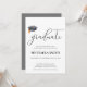 Modern and simple university PhD graduation invitation with an illustration of a black graduation cap and elegant typography. Illustrated and designed by Patricia Alvarez.