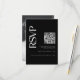 A modern, black wedding RSVP card, designed with a QR code for your guests to scan and access your wedding website, and a customisable photo section on the back. Feel free to change background colour, text colours, etc., by clicking on "personalise this design," then "edit using design tool."