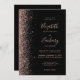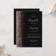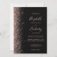 The left-hand edge of this elegant modern wedding invitation features a rose gold faux glitter design. The customisable text combines pale rose-coloured handwriting, copperplate and italic fonts on a black background. The reverse side provides space for wedding details on a solid black background, along with a QR code guests can scan to visit your website and RSVP, which saves the cost of printing and mailing separate RSVP cards.