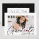 Invite guests to celebrate the graduation with our modern photo graduation party invites. The trendy graduation party invites feature the graduate's photo with "Graduate" in a black modern calligraphy script overlay. Personalize the front of the invites by adding the graduate's name, school name, and graduation year. The invite reverses to display your graduation party details and a trendy black and white dotted geometric pattern.