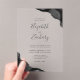 Two corners of this elegant modern wedding invitation feature black watercolor agate trimmed with faux silver glitter. The customisable text combines handwriting, copperplate and italic fonts in charcoal grey on a clear background.