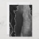 The left-hand edge of this elegant modern wedding save the date card features a black watercolor agate border trimmed with faux silver glitter. The customisable text combines charcoal grey handwriting, copperplate and italic fonts on a white background. The reverse side features a matching black and silver agate design.