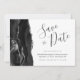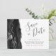 This elegant modern save the date card features a black watercolor agate border trimmed with faux silver glitter. The customisable text combines handwriting script, copperplate and italic fonts in charcoal grey on a white background. The reverse side features a matching black and silver agate design.