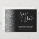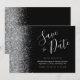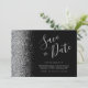 This elegant modern save the date card features a faux silver glitter border. The customisable text combines handwriting script, copperplate and italic fonts in silver grey on a black background. The reverse side features a matching black and silver glitter design.