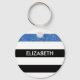 Personalise this modern wide horizontal black and white stripes pattern keychain with a blue glitter stripe by adding the name of any girly girl. This trendy graphic striped pattern is perfect for the chic fashionista. Flat printed image, NOT actual glitter.
