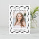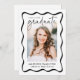 Celebrate your milestone with this Modern Black Wavy Frame graduation announcement, featuring a sleek and stylish design. The front showcases a vertical graduate photo framed by a black wavy border, with "Graduate" elegantly displayed in a handwritten black script on a crisp white background. Personalise it with your name, graduation year, and school for a unique touch. The back of the announcement highlights a horizontal photo with space for a custom message, allowing you to share your excitement and future plans. Perfect for high school and college graduates, this modern and timeless design makes a memorable keepsake for family and friends.