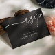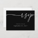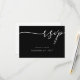 Front Side: The word "RSVP" is displayed in a contemporary white script, adding a touch of modern elegance to your event. Personalised reply dates are showcased in clean white italic sans-serif typography, perfectly complementing the elegant script. The sleek black background creates a dramatic contrast, ensuring that your RSVP details stand out.