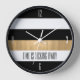 Modern black, white and gold tone clock with a bold horizontal striped pattern. Black text reads Time is ticking away. Matching home decor is available.