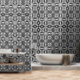 A stylish modern black and white fleur du lys peel and stick wallpaper wall treatment, to modernise your bath, kitchen, or any room. Perfect when you live in a rental apartment that needs your personal style and touches of design to make things pop. Peel and stick wallpaper is one of the best DIY hacks for apartment dwellers to give them more control over their home decor style! Go wild with patterns and colours. Comes in smooth and textured. Get the textured for bumpy textured walls, and smooth or textured for smooth walls.