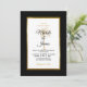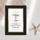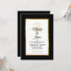 Invite your guests to help you celebrate your special day with this elegant invitation featuring modern script, black and gold text including an artistic palm tree and metallic gold frame on the front of the card. A black background is on the front and back.