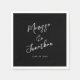This modern personalised wedding paper napkin features hand lettered white script with your names and wedding date on a simple black background. Designed by artist Susan Coffey.