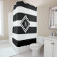 Update your bathroom with a new modern black and white shower curtain. This design has four wide horizontal stripes on white background. A large bold white monogram is on the center of black diamond shaped frame. Click personalize template option and enter your initial.