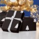 Modern Christmas trees wrapping paper. Simple black and white Nordic-inspired design features a minimalist array of Christmas trees, creating a chic look for your holiday presents.