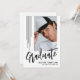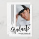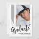 Minimalist graduation party invitations featuring a simple white background which can be changed to any colour, a photo of the grad, falling black lines which represent the tassel strings from a graduation cap, and a modern text template that is easy to personalise.