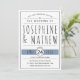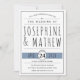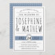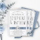 This wedding invitation features a contemporary aesthetic, incorporating a stylish combination of black, white, and dusty blue hues. The couple's names are elegantly presented in a whimsical hand-drawn typography, adding a personal touch to the design. The wedding date is prominently displayed on a charming dusty blue banner, creating a focal point. To enhance the overall presentation, a black border frames the invitation, giving it a sophisticated look. On the reverse side, a captivating dusty blue and white geometric pattern adds a distinctive and eye-catching element, making this invitation truly unique.
