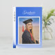 A unique and modern card with a modern blue, abstract color scheme. Similar blue background on the back of the card containing invitation details. The photo and all text is easily changed with the template. The "Graduate" text, however, is actually a graphic image but is editable. Suitable for a high school or college graduation. Selecting “Personalize this design” offers you several edit options to easily change the text (wording, plus type font, color, size, position) and to possibly edit the design elements. You may also want to scroll down to the section “Transfer design to a product” for a few suggestions about other items this design can be used on.