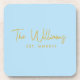 Fully customisable modern light blue drink coasters perfect for a bridal shower gift, engagement gift or housewarming gift. Features a pale blue background, modern handwritten script style font in gold tone and established date to mark the occasion.