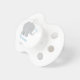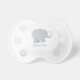 Custom baby pacifier for a baby boy features a cute little grey elephant with light blue heart shaped splashes. Design can be personalised with baby's first name or other text.