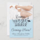 A modern chic white on blue baby bump photo pregnancy announcement with illustrated calligraphy text reading mama's little sidekick. Soft subtle colours and modern script. Coming soon!